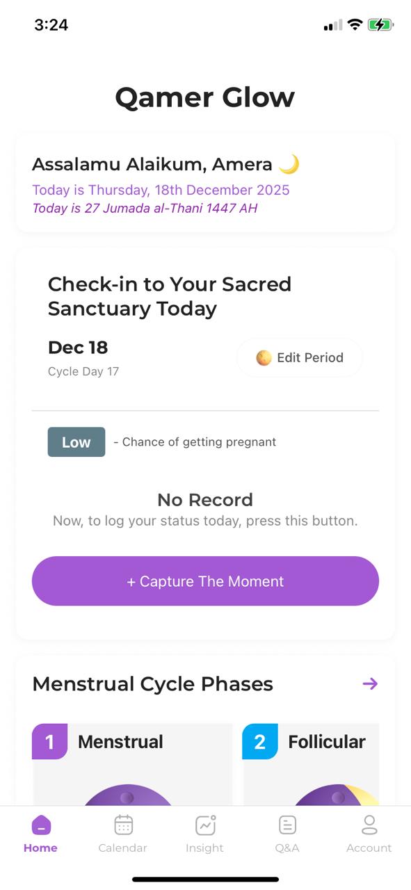 Qamar Glow is a private space to observe and understand your physical and emotional rhythm. Track your menstrual health, gain insights, manage missed fasts, and connect with a community that understands and supports you. Built by Muslim women, it provides tools and guidance that honor your values while helping you feel empowered and connected.